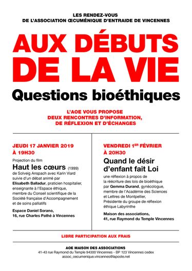 17/01/2019 - film "Haut les cœurs" de Sólveig Anspach (1999), suivi d'un débat avec Élisabeth Balladur, praticienne hospitalière, enseignante à l’Espace éthique, membre du Conseil scientifique de la Société française d'accompagnement et de soins palliatifs